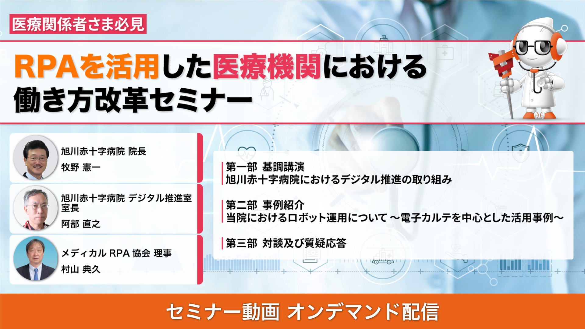 本セミナーでは、旭川赤十字病院で院長を務める牧野憲一氏、さらにデジタル推進室 室長の阿部直之氏にご登壇いただき、旭川赤十字病院におけるデジタル推進の取り組みやロボット運用方法についてご紹介いただきます。