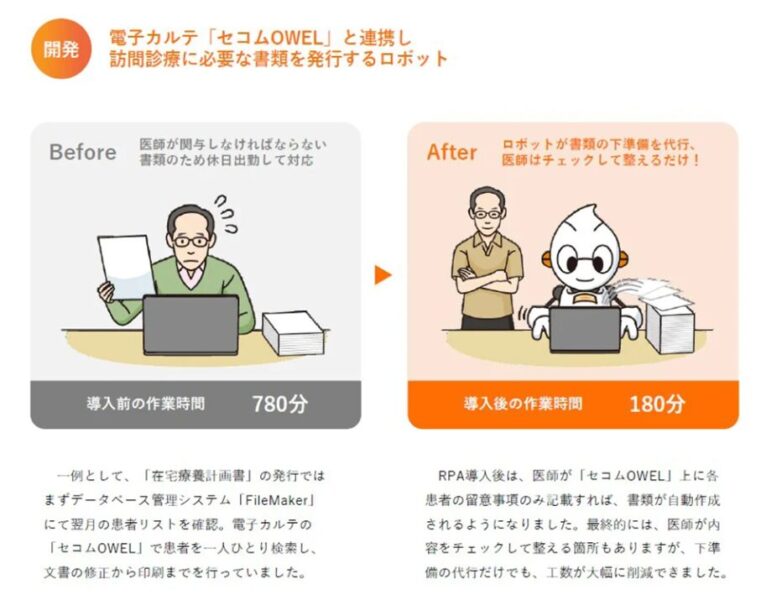 具体的には、電子カルテと連携し、「在宅療養計画書」や「訪問看護指示書」など、訪問診療に必要な書類の発行業務をBizRobo!で自動化。これまで毎月約13時間かかっていた業務が、約3時間で完了できるようになり、月10時間の休日労働の削減を実現しました。