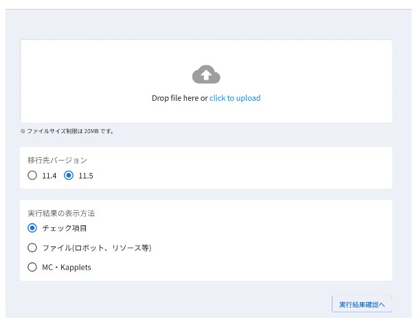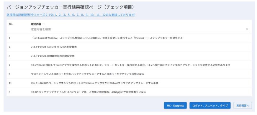 また「バージョンアップチェッカー」は、ユーザーによる確認が必要な注意事項※2に関して、対象となるMC(Management Console)ファイルや、Kappletsのバックアップファイルをアップロードするための専用フォームです。このフォームに対象ファイルをアップロードすると、バージョンアップの影響がどの範囲に及ぶのか、具体的に何を確認する必要があるのか等の情報をブラウザ上に一覧表示します。